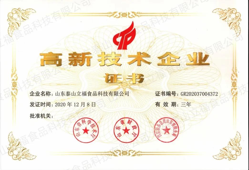根據國家《高新技術企業認定管理辦法》和《高新技術企業認定管理工作指引》的相關規定,山東泰山立福食品科技有限公司被認定為國家級高新技術企業。近...
