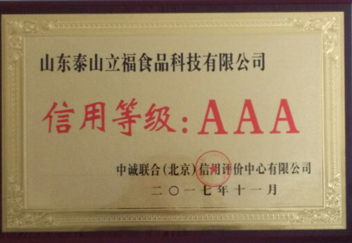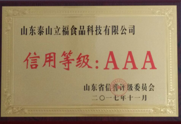 2017年11月,山東泰山立福食品科技有限公司榮獲省級信用建設先進單位、榮獲山東省信譽評級委員會AAA信用等級、中誠聯合(北京)信用評級中心AAA信用等級。