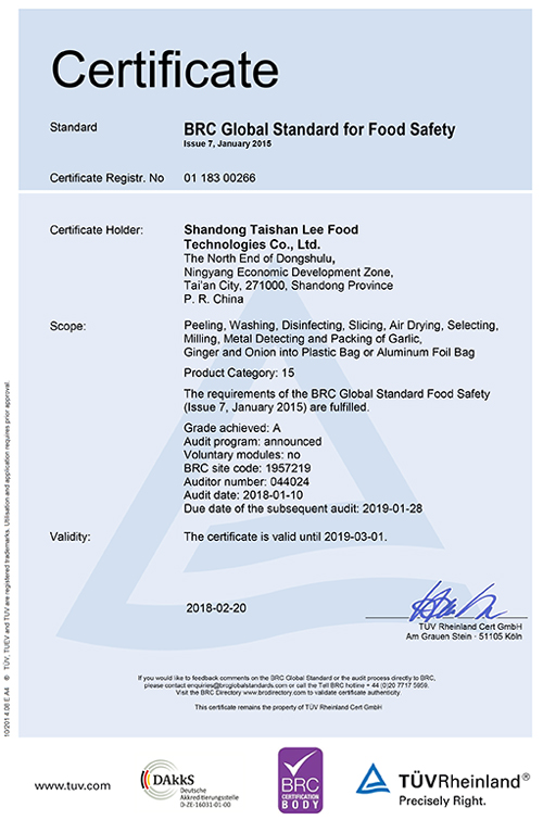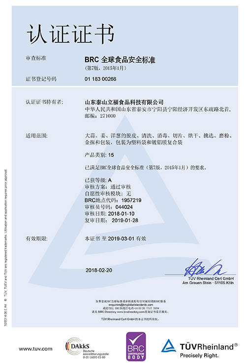 繼2017年公司取得BRC全球食品安全標準管理認證等級B級之后,2018年公司管理體系工作再創佳績,于今年2月成功通過萊茵檢測服務BRC全球食品安全標準管理認證等級A級。 此次認證成功通過不僅是我公司體系管理制度完善的體現,也是公司受到客戶和各界充分信任與支持的最佳證明,對公司下一步生產經營管理持續穩定增長具有極大的推動作用。